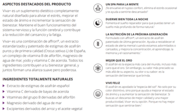 Viva+ es una combinación de affron®, un extracto estandarizado y patentado de estigmas de azafrán puros y de primera calidad (Crocus sativus L) de España, un complejo de vitamina B de alforfón, magnesio de agua de mar, yodo y vitamina C de acerola.